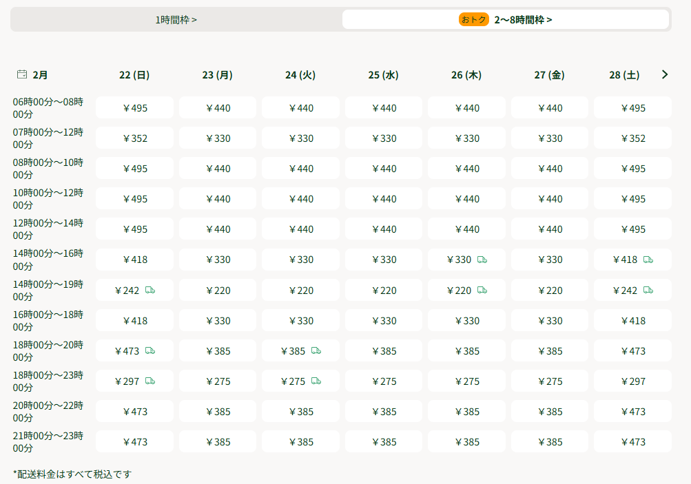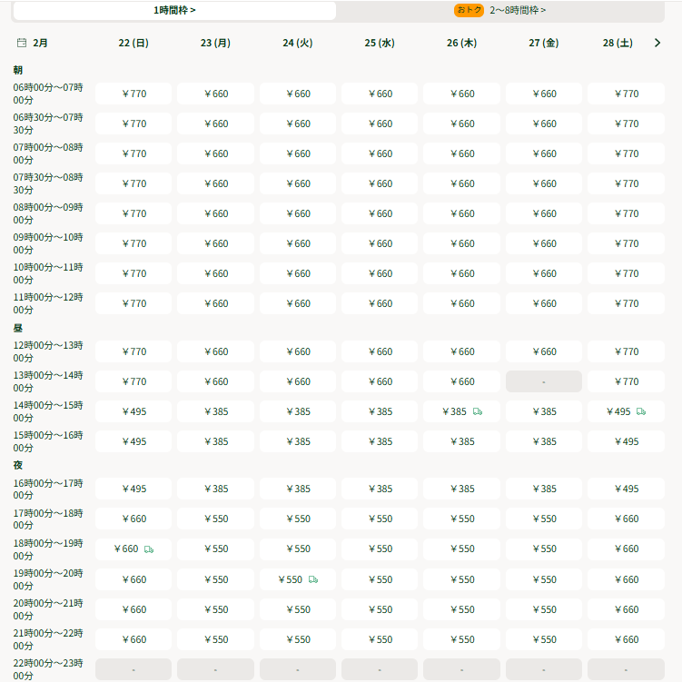 | 便利な1時間枠 | 275円〜550円 | 1時間単位でピンポイントに指定できる |