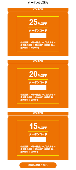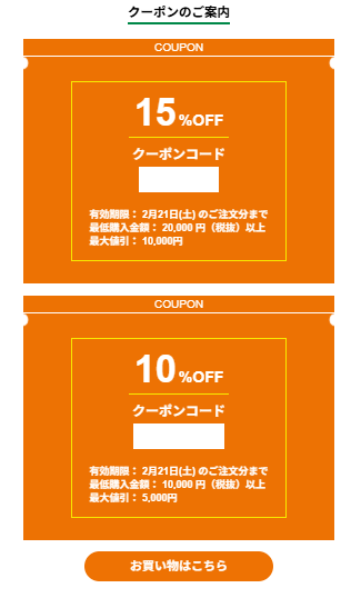 クーポンは1万円以上購入で使えることが多いです。配送料が無料になる12,000円(税抜)以上の注文でクーポンを使うととてもお得。
